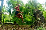 Mindre trädstammar och stenblock som täcker vägen är vanligt vid traillöpning. Du kan lätt ta dig över dessa genom att göra ett dynamiskt frånskjut och hoppa över. Det krävs dock att underlaget tillåter att du landar tryggt på den främre foten som en fortsättning på rörelsen. Om hindret är högt, så är det bra om du landar på båda fötterna. Då kan du också ta stöd med ena handen på trädstammen när du hoppar över.